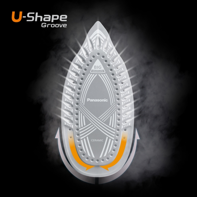 Thiết kế rãnh chữ U với 27 lỗ thoát hơi cho phép phân tán hơi nước đều khắp mặt đế, tăng hiệu quả là ủi trên diện rộng. Đầu ủi nhọn giúp tiếp cận dễ dàng các khu vực khó ủi như cổ áo, hàng cúc hay tay áo.