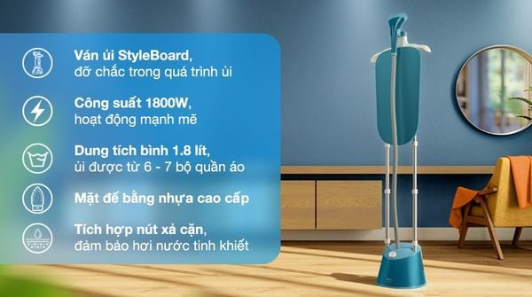 Tích hợp ván ủi StyleBoard giúp cố định bề mặt vải, hỗ trợ ủi phẳng hiệu quả cả những chi tiết khó như cổ áo, tay áo, nếp gấp.