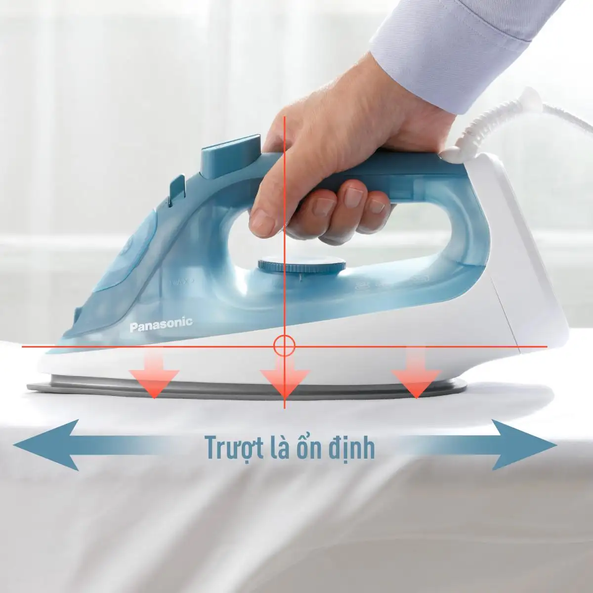 Bàn ủi Panasonic được trang bị hệ thống phun hơi mạnh mẽ, tỏa đều nhờ rãnh hình chữ U ở mặt đế. Luồng hơi phân bổ đồng đều giúp làm phẳng quần áo hiệu quả hơn, kể cả những nếp gấp cứng đầu.