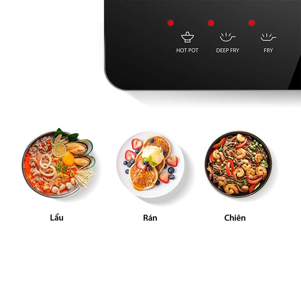 Bếp được tích hợp sẵn ba chế độ: nấu lẩu, chiên và chiên ngập dầu. Bạn có thể dễ dàng lựa chọn chế độ phù hợp chỉ với một nút bấm, giúp nấu ăn nhanh chóng mà không cần canh chỉnh nhiều.
