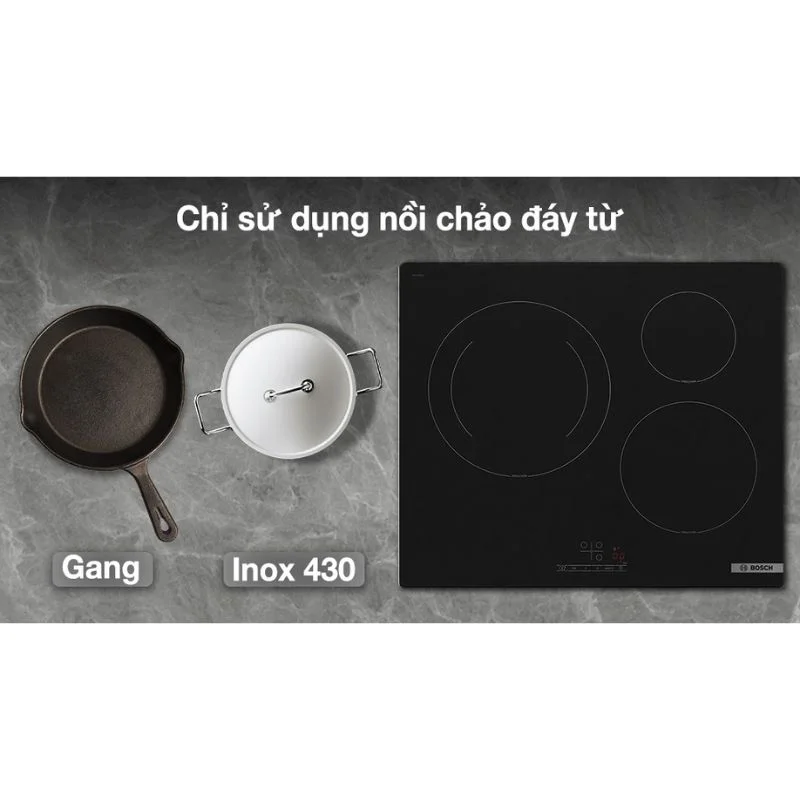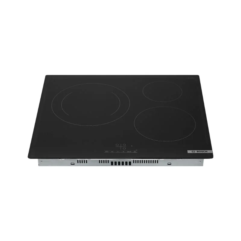 Bosch PUJ61RBB5E trang bị 3 vùng nấu cảm ứng với kích thước và công suất khác nhau, cho phép bạn sử dụng nhiều loại nồi chảo cùng lúc. Thiết kế bề mặt nấu rộng giúp tiết kiệm thời gian, đặc biệt hữu ích khi chuẩn bị nhiều món ăn.