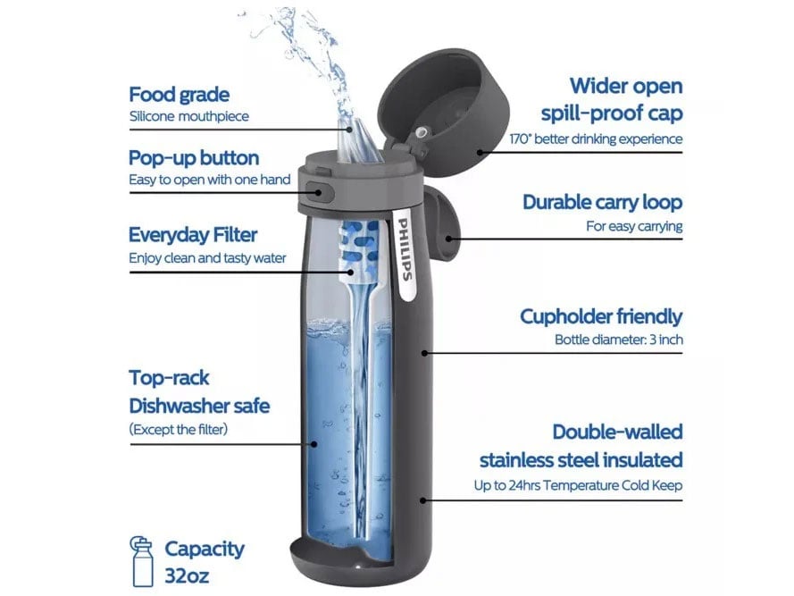 Bình được trang bị lõi than hoạt tính giúp loại bỏ clo và hạt sạn, đồng thời cải thiện mùi vị của nước máy, cho nguồn nước tinh khiết hơn và có thể uống trực tiếp.