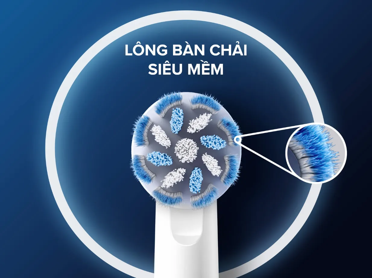 Đầu bàn chải sử dụng sợi lông mảnh và mềm hơn 25% so với các loại thông thường, giúp làm sạch mà không gây kích ứng, phù hợp với người có nướu nhạy cảm, sau điều trị nha khoa, hoặc đang niềng răng.