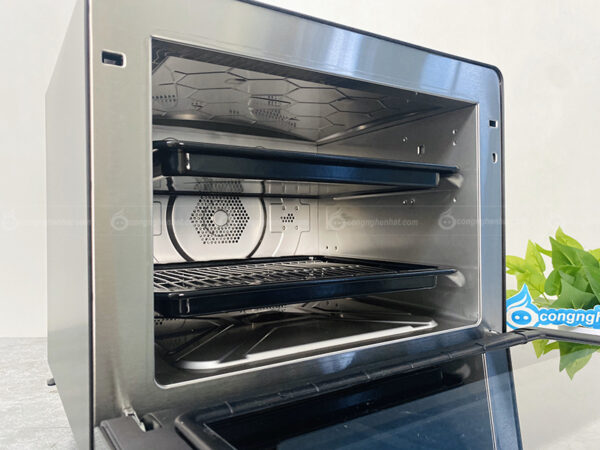 Cửa lò mở theo kiểu kéo xuống tiện lợi, dễ thao tác. Khi mua sản phẩm, người dùng còn được tặng kèm bộ khay và vỉ nướng cao cấp, hỗ trợ quá trình nấu ăn trở nên linh hoạt và hiệu quả hơn.