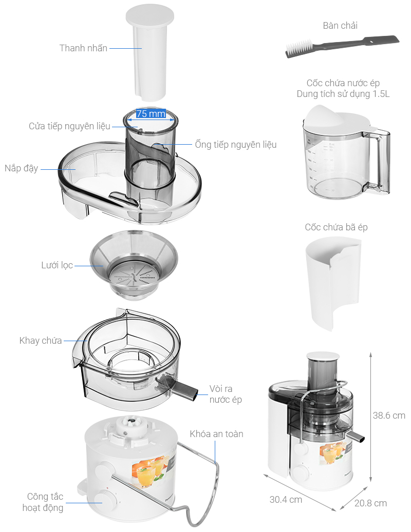Chất liệu phụ kiện: Thanh nhấn nhựa, lưới lọc thép không gỉ, cốc đựng nước ép nhựa, cốc đựng bã ép nhựa