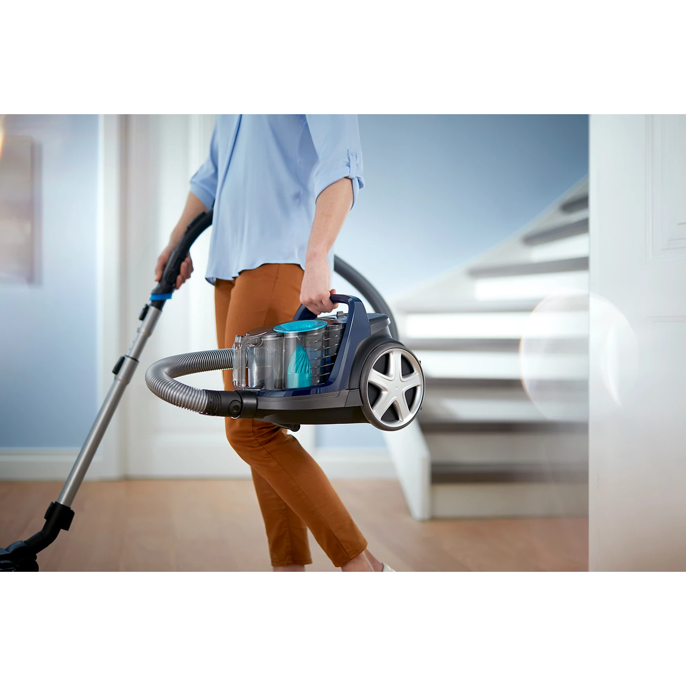 Thiết kế khí động lực học tăng tốc luồng khí trong khoang hình trụ, kết hợp lưỡi dao tách bụi giúp duy trì lực hút mạnh và ổn định trong suốt quá trình dọn dẹp.