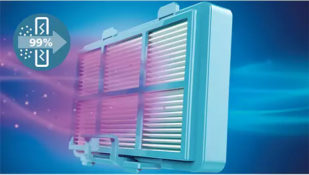 Lọc sạch hơn 99,9% hạt bụi nhờ bộ lọc động cơ có thể giặt, đảm bảo không khí trong nhà luôn sạch sẽ.