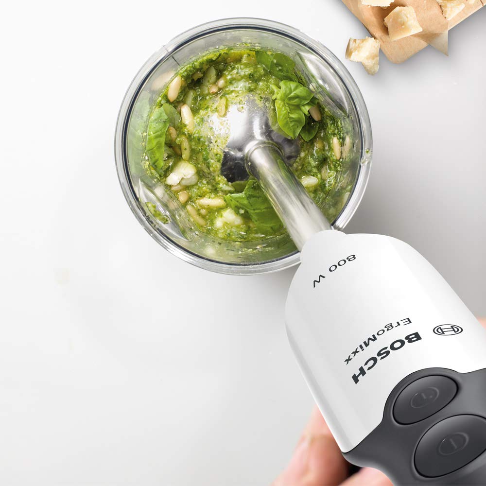 Với động cơ mạnh mẽ 800W, Bosch MS6CA4150G có thể dễ dàng xay nhuyễn nhiều loại thực phẩm từ mềm đến cứng, bao gồm trái cây, rau củ, các loại hạt, thịt, thậm chí là đá viên nhỏ. Nhờ công suất cao, bạn có thể chế biến món ăn nhanh chóng mà không lo thực phẩm còn lợn cợn.