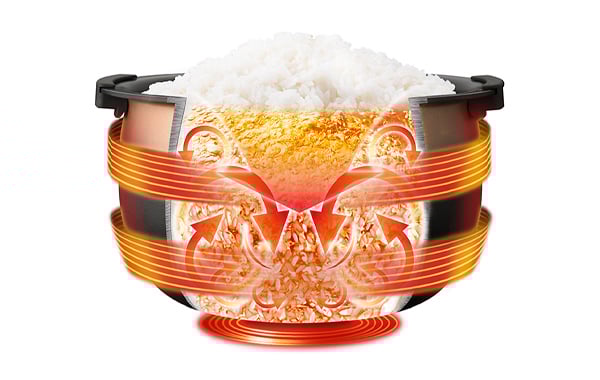 Với diện tích bề mặt lớn được làm nóng bằng công nghệ cảm ứng từ (IH), nhiệt lượng cao được phân bổ đều và nhanh chóng lan tỏa đến từng hạt gạo. Điều này giúp cơm chín đều từ trong ra ngoài, tơi xốp, không bị vón cục.