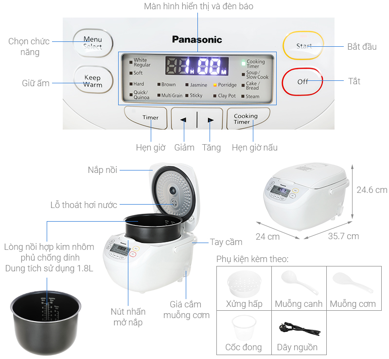 | Chức năng nấu | Gạo trắng (thường, dẻo, cứng), Nấu nhanh/Diêm mạch, Gạo lứt, Hỗn hợp, Gạo Jasmine, Gạo nếp, Cháo, Cơm niêu, Súp/Nấu chậm, Bánh/Bánh mì, Hấp |