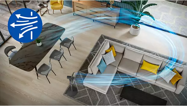 Góc xoay 80° kết hợp với khả năng nghiêng 30° giúp luồng gió lan tỏa rộng khắp không gian, đáp ứng nhu cầu làm mát ở nhiều vị trí.