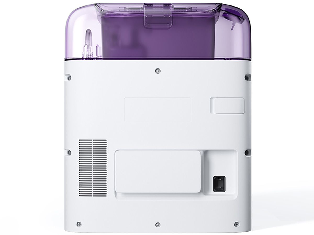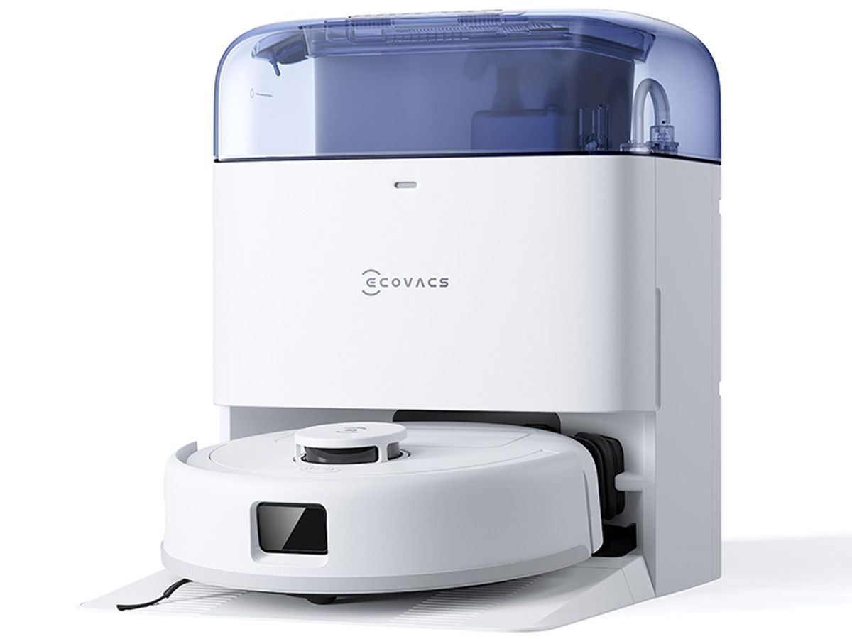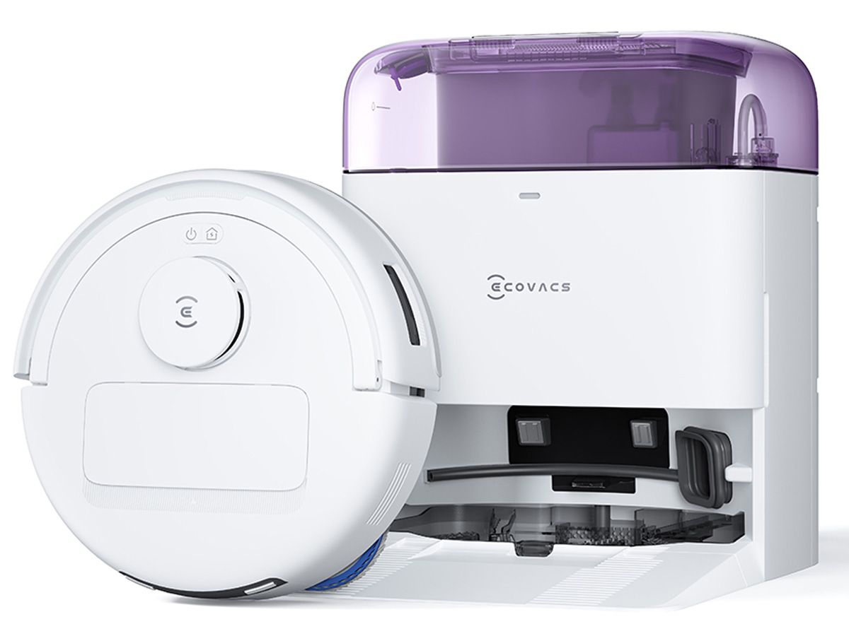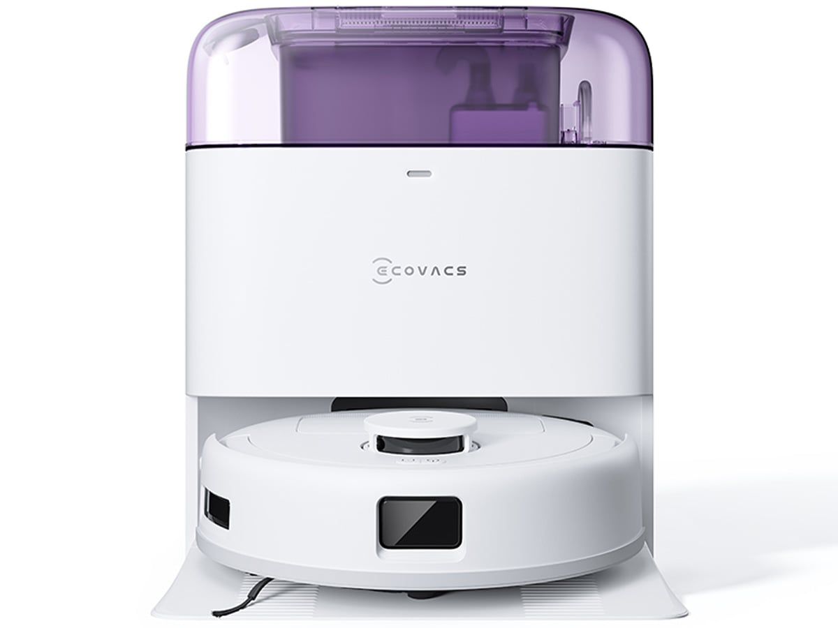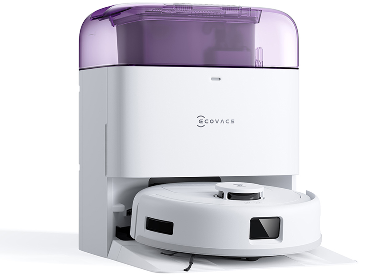Trạm sạc cao chỉ 38.5cm, tiết kiệm không gian nhưng vẫn tích hợp đầy đủ tiện ích: tự động giặt giẻ, sấy khô bằng khí nóng 45°C, tự động đổ rác và khử khuẩn nước đến 99.99% (khi dùng dung dịch chuyên dụng). Thiết kế màu pastel (tím, xanh dương) mang lại sự trẻ trung, hiện đại.