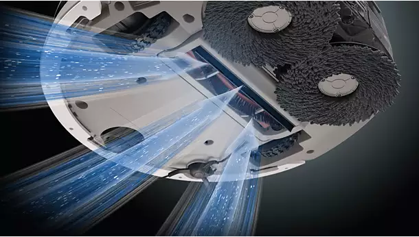 Kết hợp lực hút 2700Pa loại bỏ bụi và tóc ở phía trước, bàn lau xoay kép tốc độ 120 vòng/phút ở phía sau giúp xử lý hiệu quả các vết bẩn cứng đầu.